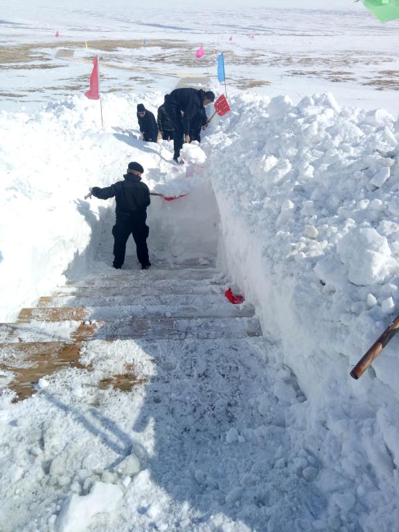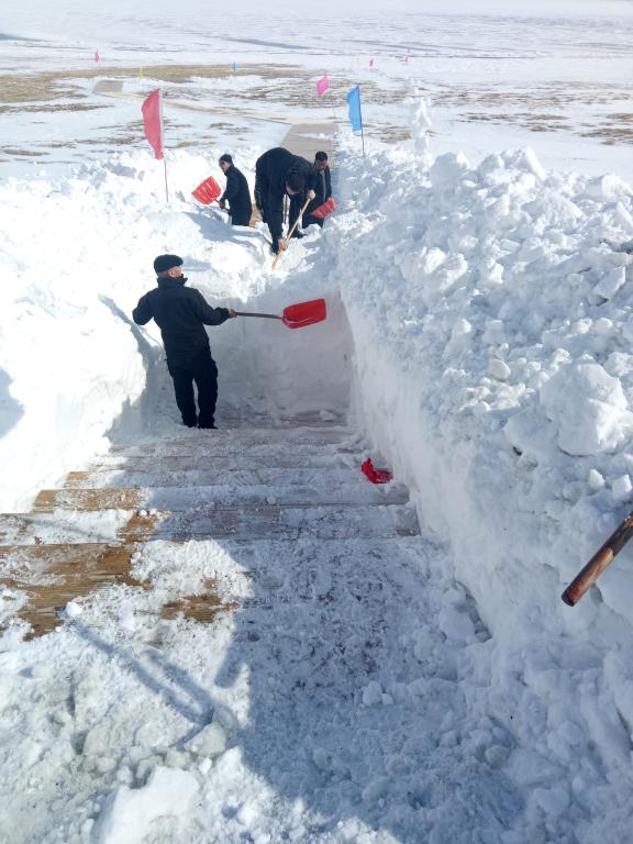 赛里木湖景区执法局南门中队6人清理木栈道积雪,同时执法巡逻工作人员做好牧民转场的后勤保障工作,为转场的伊犁牧民提供热水、感冒药等服务,确保转场的伊犁牧民安全通过博州界线。