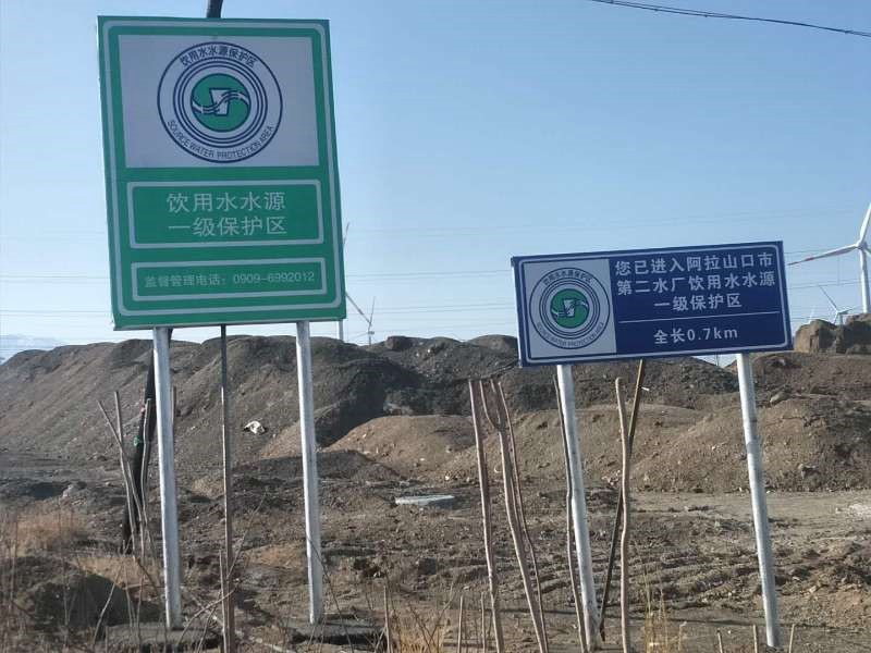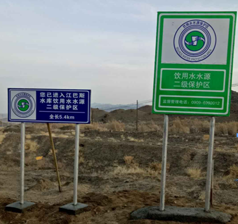 阿拉山口市水利(水务)局调取划定饮用水水源地保护区划定方案边界设置相关资料,参照国家环保部发布的《饮用水水源地保护区标志技术要求》(HJ\T433-2008),制作了相应规格的地理界标和警示标志。在我市第二水厂一级保护区设立了饮用水水源一级保护区界标和饮用水水源保护区道路警示牌3块。在江巴斯水库一级保护区和二级保护区的相应位置树立了饮用水水源地保护区地理界标和警示标志8块。